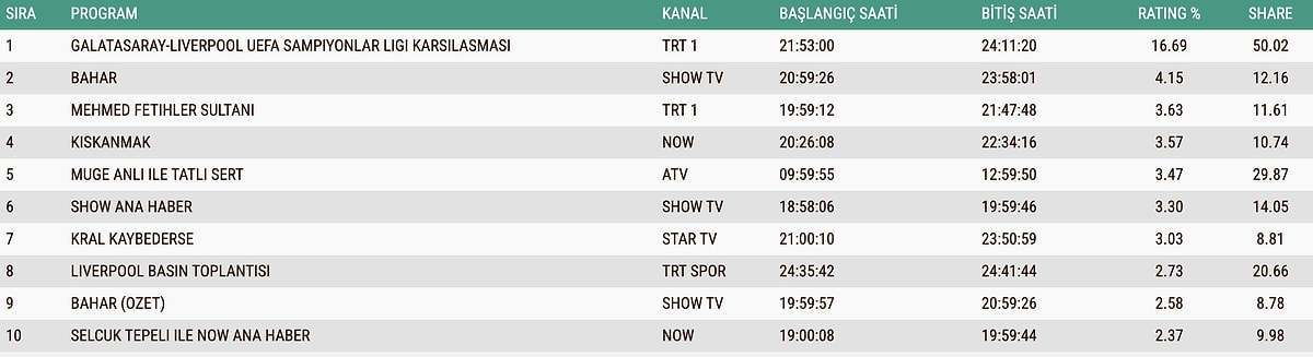 Gündüz kuşağının iki güçlü programı olan Müge Anlı ile Tatlı Sert ve Esra Erol’da, maçın akşam kuşağını domine etmesine rağmen zirveye yakın sonuçlar elde etti. Müge Anlı ile Tatlı Sert, TOTAL’de 4.83 reyting ile üçüncülüğe yerleşirken, Esra Erol’da programı ise 4.30 reyting ile dördüncü sırada kendine yer buldu. Bu sonuçlar, gündüz kuşağı formatlarının istikrarının ve kemikleşmiş izleyici kitlesinin gücünü bir kez daha kanıtladı. Dizilerden Kıskanmak ise 3.44 reyting alarak TOTAL’de ilk beşi tamamlayan tek dizi olmayı başardı. Büyük umutlarla yayına başlayan Kral Kaybederse dizisi ise ilk 10’da kendine yer bulamayarak hayal kırıklığı yarattı.